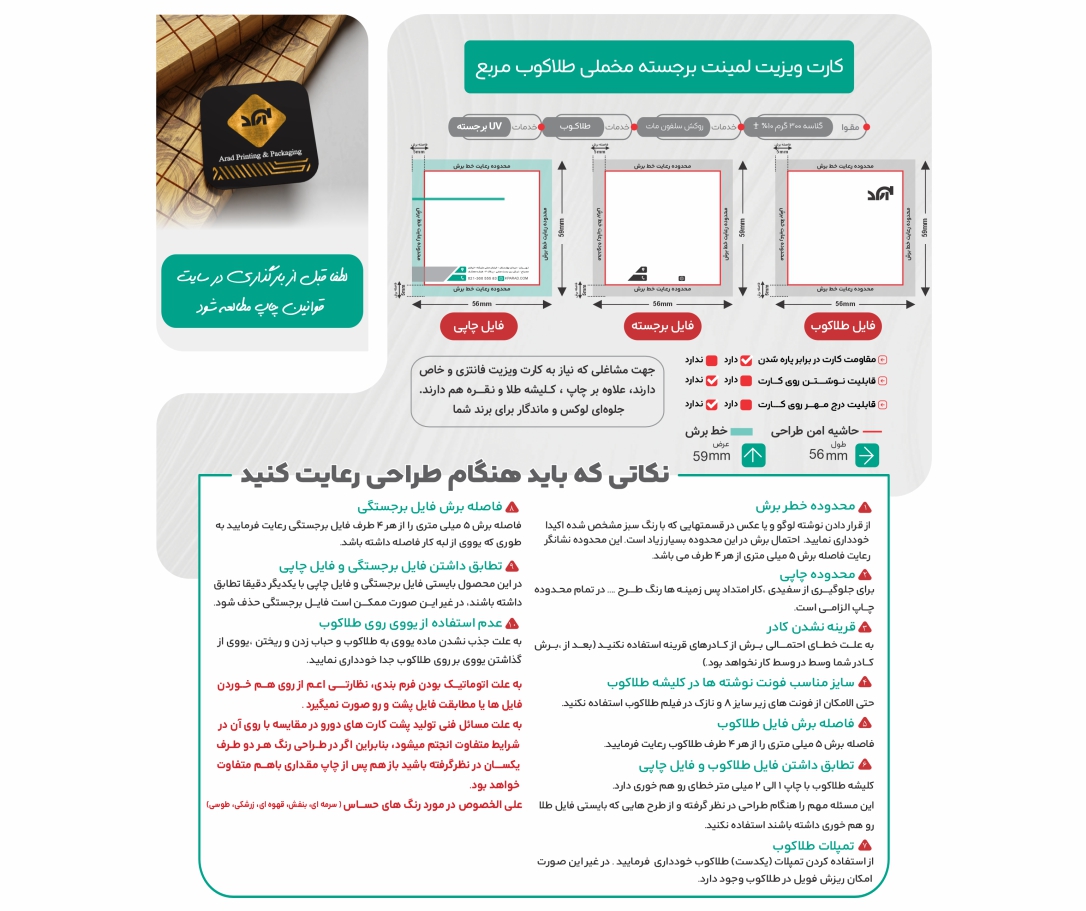راهنما: 1- خط قرمز رنگ، خط برش است. یعنی قطعاً از کناره کار بریده می شود. 2- خط مشکی رنگ، حاشیه احتیاط است. یعنی در طراحی نوشته یا عکس مهمی در این بخش قرار نگیرد. چون احتمال برش وجود دارد.